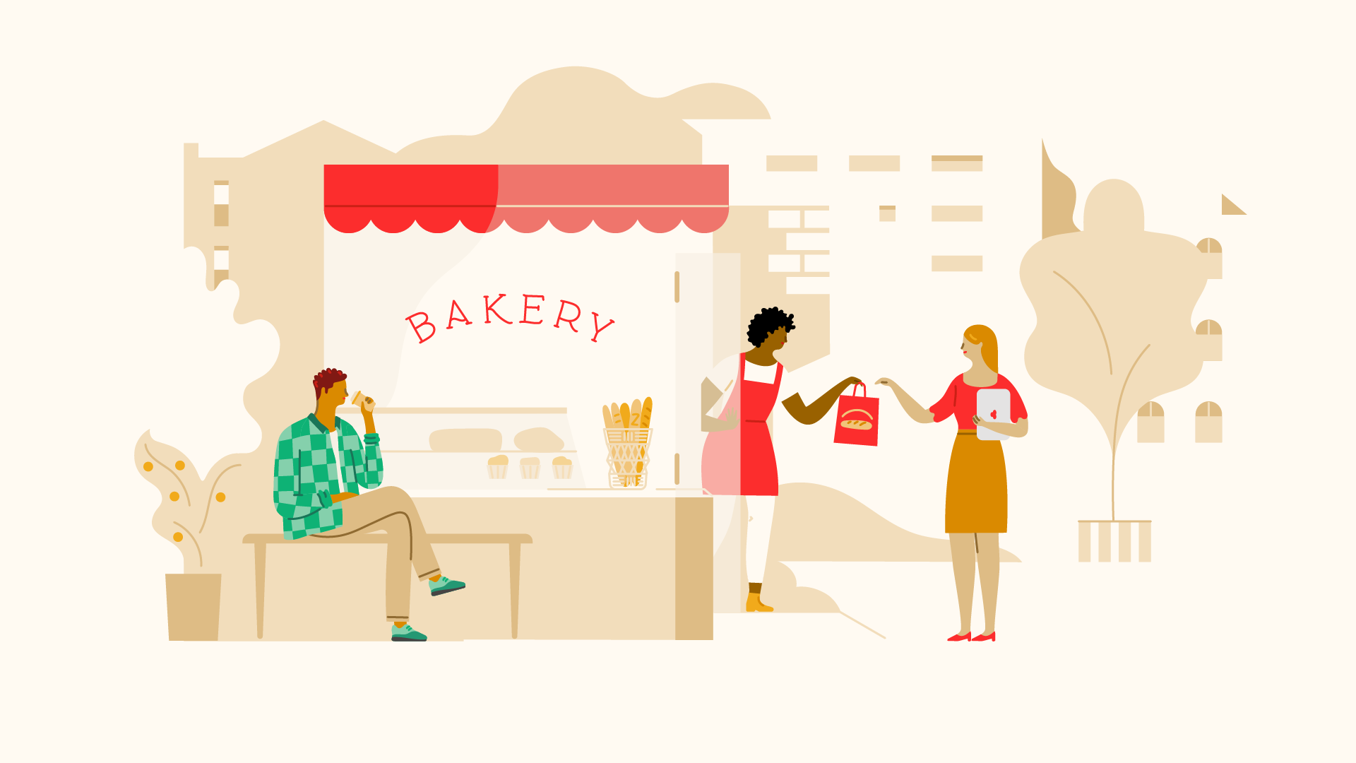 A key part of the illustration is to introduce the agent as a main figure in the scenes and stories told. We want to reinforce the link between the brand and the people in the neighborhood.